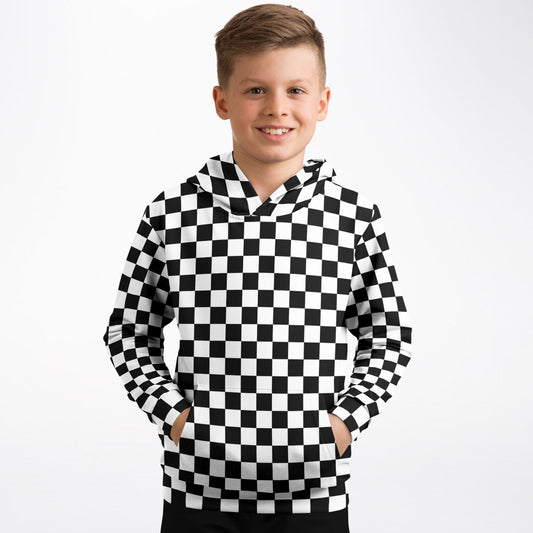 Checkered Kids Pullover Hoodie, Black White Check Girls Boy Toddler Youth Children Fleece Graphic Cozy Cotton Hooded Sweatshirt Pockets