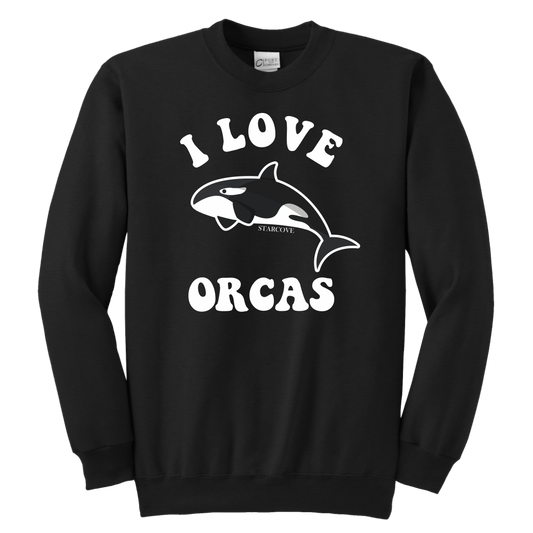 I Love Orcas Kids Sweatshirt, Killer Whales Ocean Beach Gift Graphic Sea Youth Crewneck Girls Boys Children Pullover
