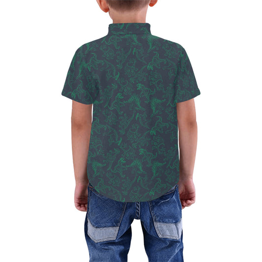 Dinosaur Boys Button Up Shirt, Dino Green Fun Animals Print Kids Dress Buttoned Collar Dress Shirt with Chest Pocket Short Sleeve