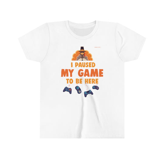 Funny Thanksgiving Kids Shirt, I Paused My Game To Be Here, Boy Girls Teen Fall Video Gamer Gaming Turkey Fun Youth Gift