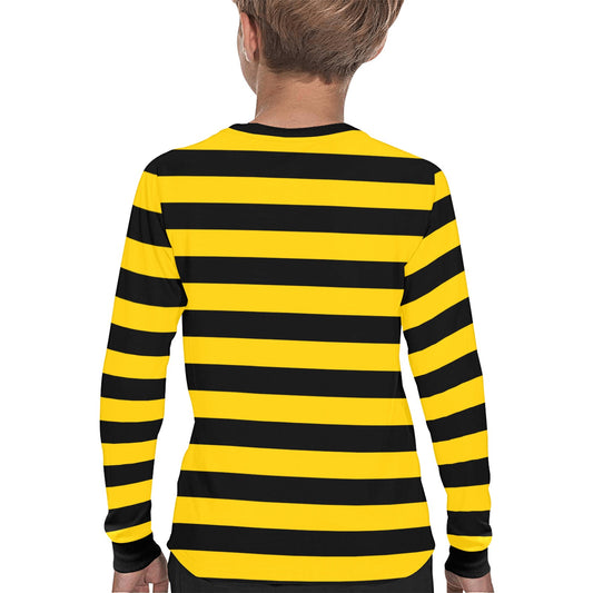 Black and Yellow Striped Kids Long Sleeve Tshirt, Unisex Boys Girls Horizontal Stripes Designer Graphic Aesthetic Printed Crew Neck Tee Top