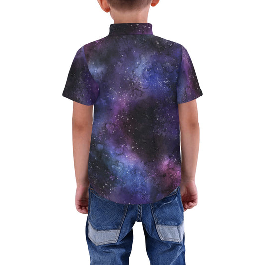 Galaxy Boys Button Up Shirt, Space Stars Universe Print Kids Dress Buttoned Collar Dress Shirt with Chest Pocket Short Sleeve