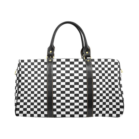 Checkered Travel Duffle Bag, Black White Check Waterproof Top Zipper Shoulder Leather Strap Handle Overnight Weekender Carry On Luggage