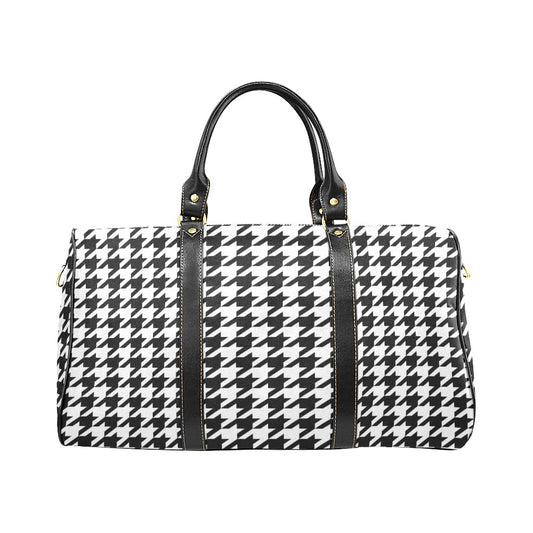 Houndstooth Waterproof Travel Bag, Black White Top Zipper Shoulder Bag Leather Strap Handle Overnight Weekender Duffle Carry On Luggage