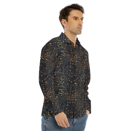 Engineer Men's Lapel Collar Shirt Concealed Placket, Circuit Board Programmer Coder Long Sleeve Button Up Dress Nerd Office Plus Size