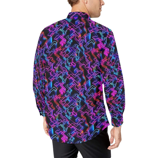80s Arcade Light Long Sleeve Men Button Up Shirt, 1980s Space Print Buttoned Down Guys Male Collared Casual Dress Shirt