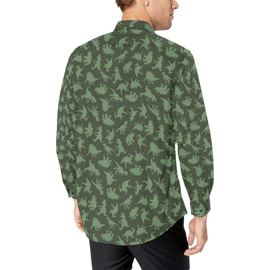 Dinosaurs Long Sleeve Men Button Up Shirt, Dino Green Print Buttoned Collar Casual Shirt with Chest Pocket