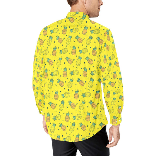 Yellow Pineapple Long Sleeve Men Button Up Shirt, Summer Fruit Print Dress Buttoned Collar Dress Shirt with Chest Pocket