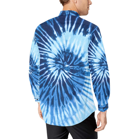 Blue Tie Dye Long Sleeve Men Button Up Shirt, Hippie Groovy Stars Print Buttoned Collar Dress Shirt with Chest Pocket