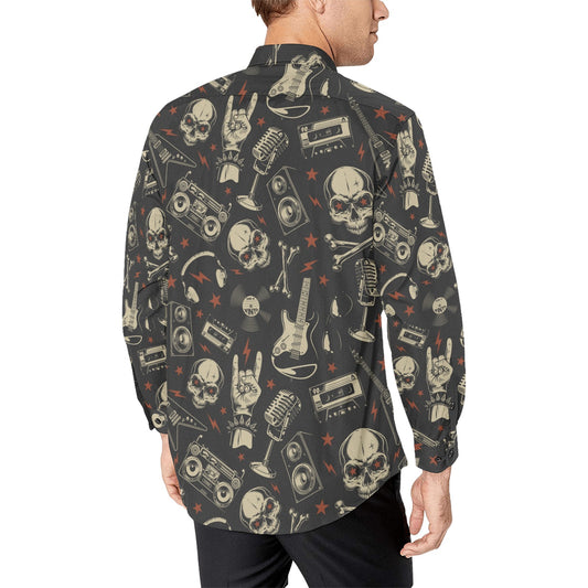 Rock Skull Long Sleeve Men Button Up Shirt, Classic Metal Music Band Guitar Print 80s Buttoned Collar Dress Shirt with Chest Pocket Guys
