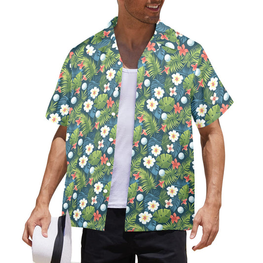 Golf Men Hawaiian shirt, Ball Floral Flowers Beach Green Leaves Vintage Aloha Hawaii Retro Tropical Plus Size Pocket Guys Button Down