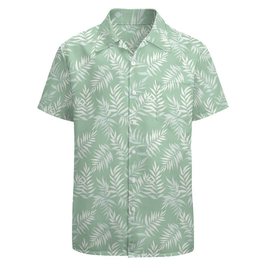 Mint Green Men Button Up Shirt, Tropical Leaves Light Short Sleeve Print Casual Buttoned Down Male Guys Collared Designer Dress Chest Pocket