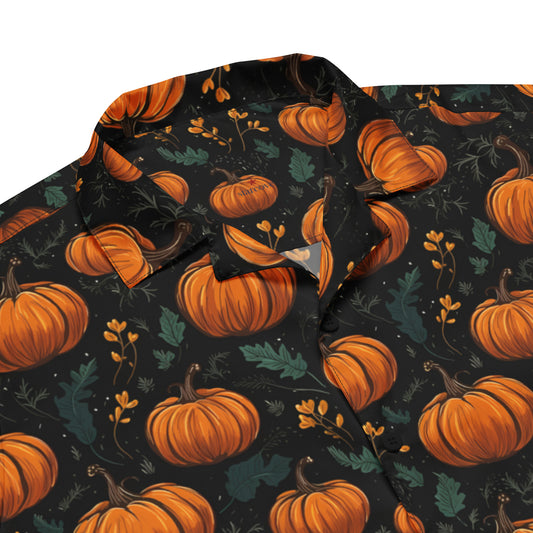 Pumpkins Short Sleeve Button Up Shirt, Fall Autumn Orange Print Casual Men Women Buttoned Down Summer Collared Dress Moisture Wicking Shirt