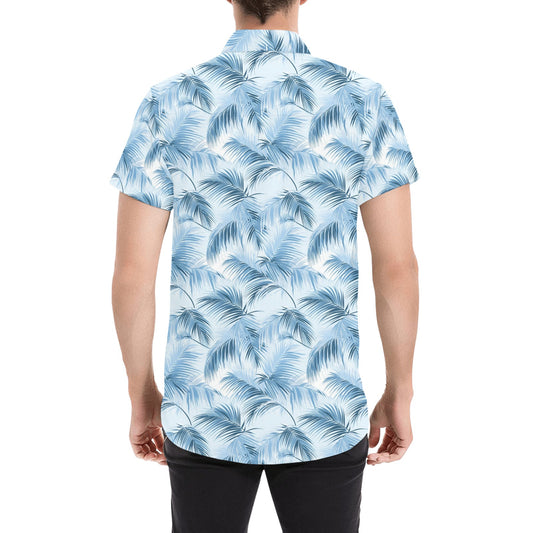 Palm Tree Leaves Short Sleeve Men Button Up Shirt, Blue Tropical Hawaiian Print Casual Buttoned Down Summer Dress Collared Shirt