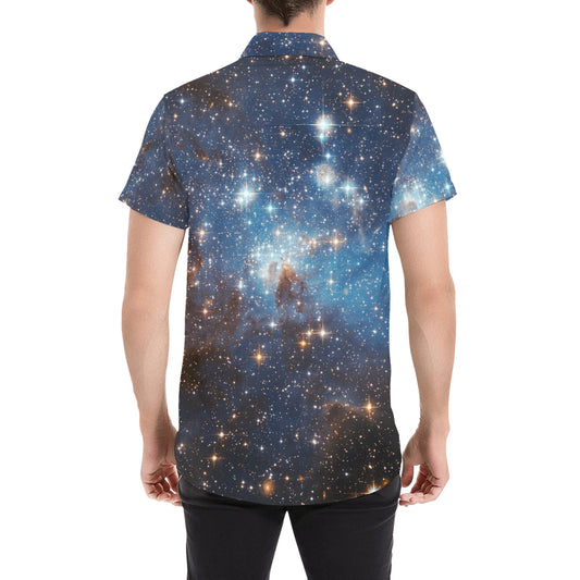 Galaxy Short Sleeve Men Button Down Shirt, Blue Outer Space Universe Astronomy Print Casual Buttoned Up Summer Collared Dress Plus Size