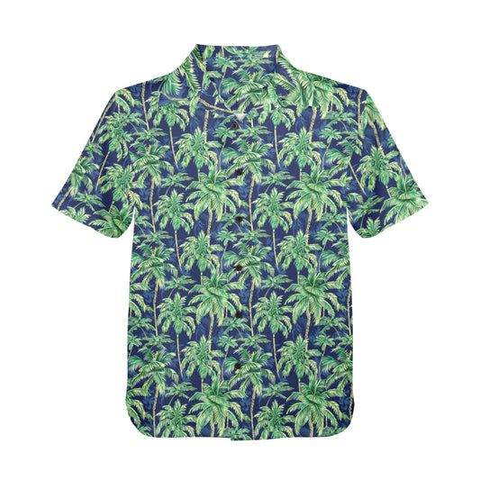 Blue Hawaiian Men Shirt with Palm Trees, Green Beach Print Vintage Aloha Hawaii Retro Summer Tropical Plus Size Pocket Guys Button Down