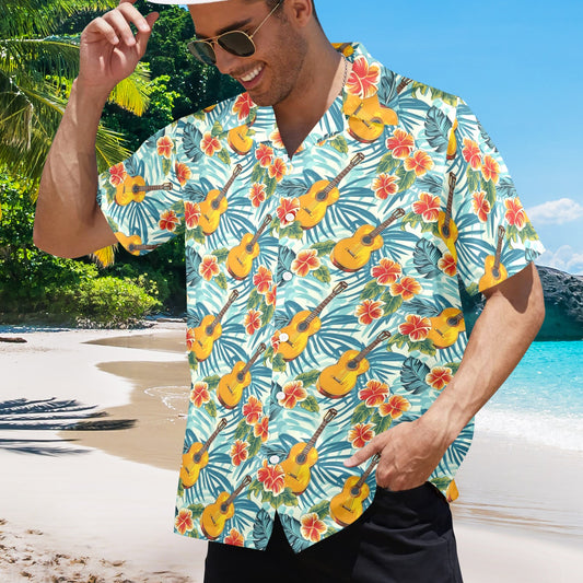 Guitar Men Hawaiian shirt, Music Band Floral Flowers Beach Green Vintage Aloha Hawaii Retro Tropical Plus Size Pocket Guys Button Down