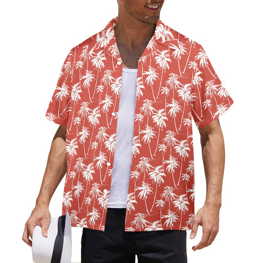 Red and White Men Hawaiian shirt, Palm Trees Designer V Neck Vintage Aloha Hawaii Retro Summer Tropical Beach Plus Size Guys Button Down