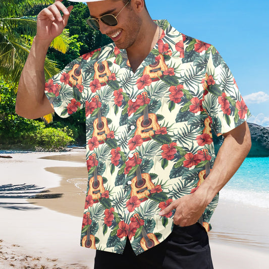 Guitar Men Hawaiian shirt, Music Band Floral Flowers Beach Red Green Vintage Aloha Hawaii Retro Tropical Plus Size Pocket Guys Button Down