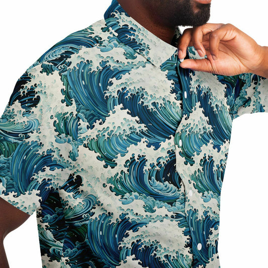 Great Wave Short Sleeve Men Button Up Shirt, Japanese Ocean Sea Blue Print Casual Buttoned Down Summer Guys Collared Dress Shirt