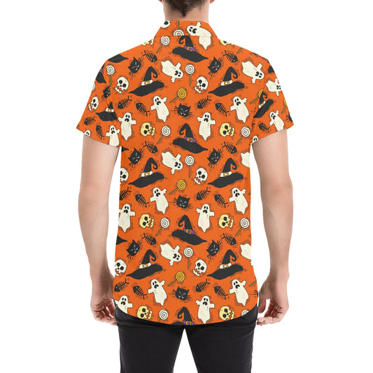 Halloween Short Sleeve Men Button Up Shirt, Spooky Orange Cats Ghosts Print Casual Buttoned Down Summer Dress Shirt Gift Husband