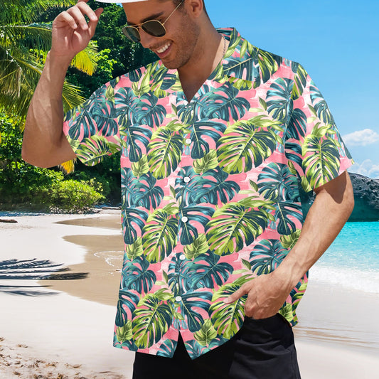 Pink Tropical Men Hawaiian shirt, Green Monstera Leaf Vintage Aloha Hawaii Retro Summer Tropical Beach Plus Size Pocket Guys Button Down