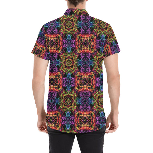 Psychedelic Short Sleeve Men Button Down Shirt, Vintage Trippy Rave Glow Lights Print Casual Buttoned Summer Dress Collared Shirt
