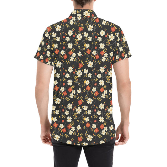 Black Floral Short Sleeve Men Button Up Shirt, Flowers Cottagecore Print Casual Buttoned Down Summer Dress Guys Male Collared Shirt