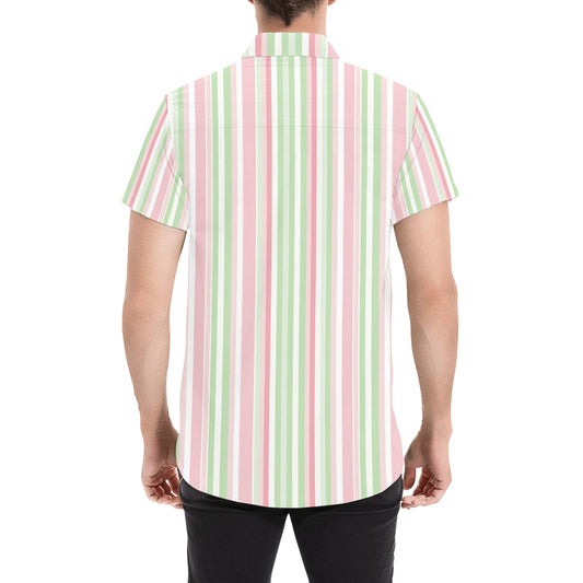 Pink Green Striped Short Sleeve Men Button Down Shirt, Vertical Stripes Vintage Retro Print Casual Buttoned Summer Dress Collared Shirt