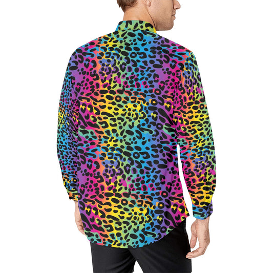 Rainbow Leopard Men Button Up Shirt, Colorful Long Sleeve Animal Print Buttoned Down Collar Male Guys Casual Dress Shirt Chest Pocket