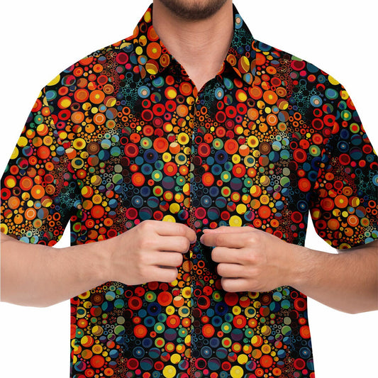 Psychedelic Men Button Up Shirt, Funky Red Colorful Fun Retro Vibrant Dot Art Vintage Short Sleeve Festival Down Guys Collared Designer