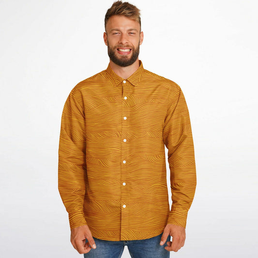 Orange Long Sleeve Men Button Up Shirt, Wave Pattern Guys Male Print Buttoned Down Collared Graphic Casual Dress Plus Size Shirt