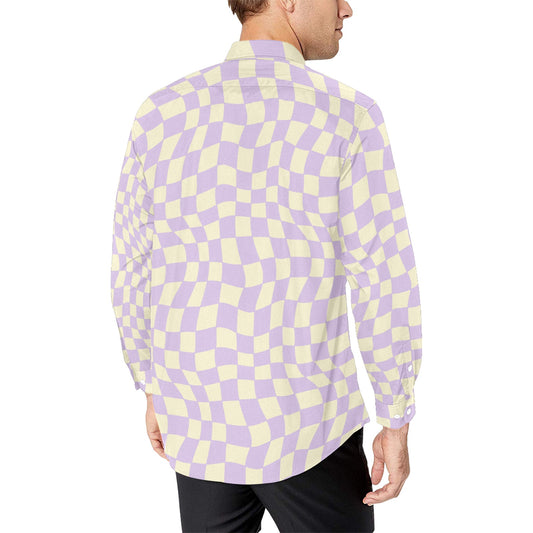 Checkered Long Sleeve Men Button Up Shirt, Pastel Purple Groovy Lilac Check 70s Vintage Print Buttoned Down Guys Male Collar Casual Dress