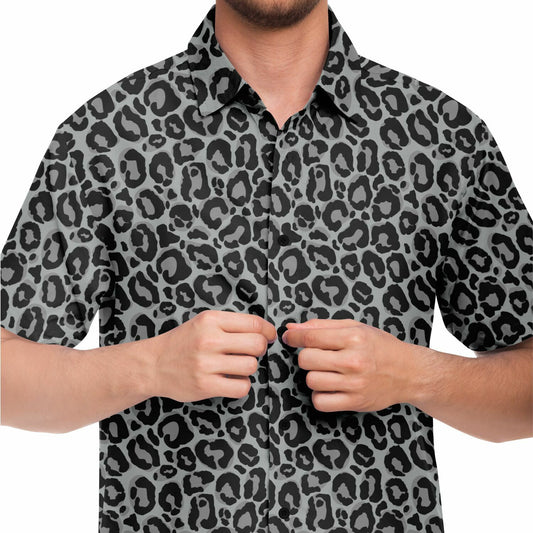 Grey Leopard Men Button Up Shirt, Animal Cheetah Print Short Sleeve Print Casual Buttoned Down Summer Male Guys Collared Designer Dress