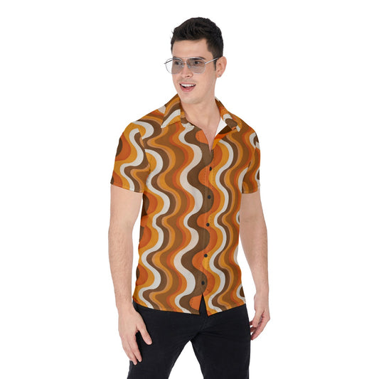 70s Wavy Stripes Men Button Up Shirt, Retro Vintage Brown Short Sleeve Print Casual Buttoned Down Summer Male Guys Collared Designer Dress