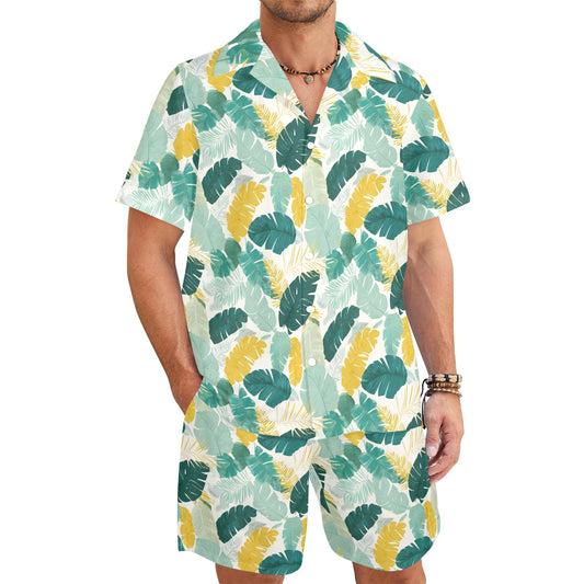 Tropical Leaf Shirt Shorts Outfit Set Men, Plants Banana Palm Tree Green Beach Sea Hawaiian Beach Male Guys Short Sleeve Button Up Down Luau