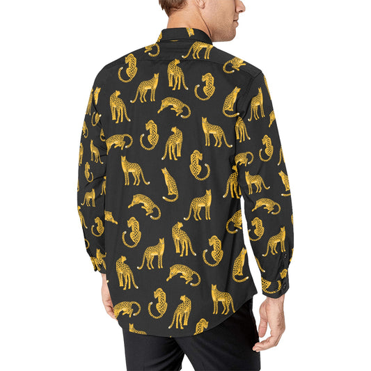 Leopard Men Button Up Shirt, Long Sleeve cheetah Animals Print Black Gold Buttoned Collar Dress Shirt with Chest Pocket
