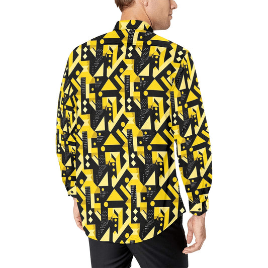 Black Yellow Geometric Long Sleeve Men Button Up Shirt, Abstract Modern Print Casual Buttoned Collared Designer Dress Shirt Chest Pocket