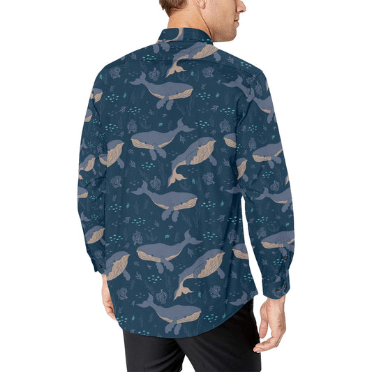 Blue Whale Men Button Up Shirt, Long Sleeve Marine Animals Beach Sea Fish Print Dress Buttoned Collar Dress Shirt with Chest Pocket