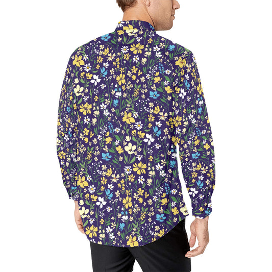Floral Long Sleeve Men Button Up Shirt, Flowers Purple Print Casual Buttoned Collared Designer Dress Shirt with Chest Pocket