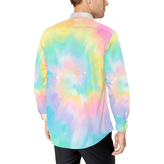 Pastel Tie Dye Long Sleeve Men Button Up Shirt, Rainbow Groovy Spiral Print Buttoned Collared Casual Dress Shirt with Chest Pocket