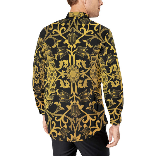 Retro Long Sleeve Men Button Up Shirt, Vintage Steampunk Baroque Print Black Gold Casual Dress Casual Buttoned Collared with Chest Pocket