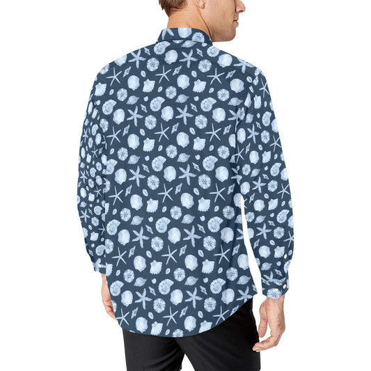 Ocean Men Button Up Shirt, Long Sleeve Beach Sea Shells Star Fish Blue Print Dress Buttoned Collar Dress Shirt with Chest Pocket