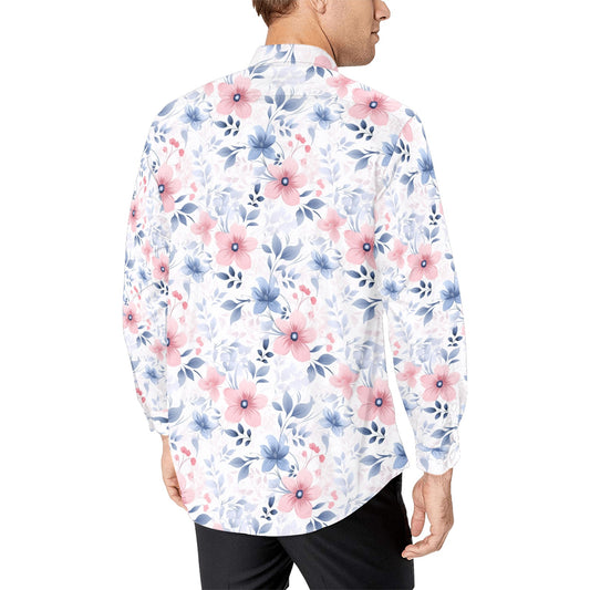 Pink Blue Floral Long Sleeve Men Button Up Shirt, White Flowers Print White Casual Buttoned Collared Designer Dress Shirt with Chest Pocket