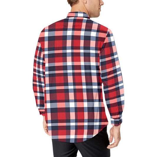 Red White Blue Plaid Long Sleeve Men Button Up Shirt, American Check Tartan Print Dress Buttoned Collar Dress Shirt with Chest Pocket