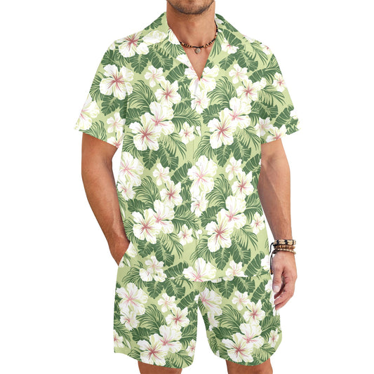 Tropical Shirt Shorts Outfit Set Men, Green White Floral Hibiscus Flower Matching Hawaiian Beach Male Summer Short Sleeve Button Up Down