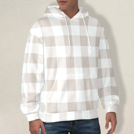 Beige White Buffalo Plaid Flannel Hoodie, Cream Check Fleece Lined Heavyweight Pocket Men Women Unisex Graphic Hooded Sweatshirt Jacket