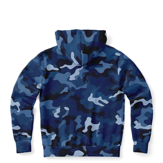 Navy Blue Camo Zip Up Hoodie, Camouflage Full Zipper Pocket Men Women Unisex Adult Aesthetic Graphic Cotton Fleece Hooded Sweatshirt