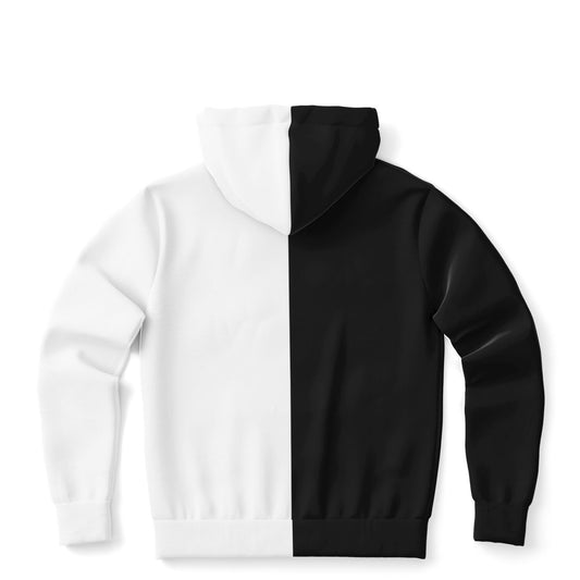 Half Black and Half White Zip Up Hoodie, Two Tone Color Split Full Zipper Pocket Men Women Unisex Adult Cotton Fleece Hooded Sweatshirt