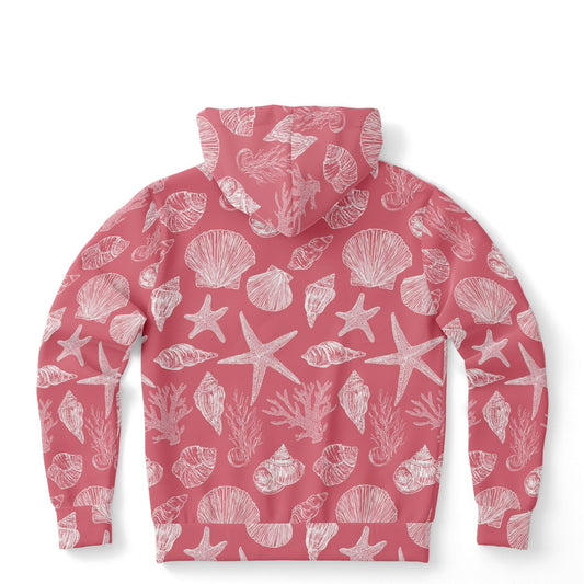 Coral Pink Beach Hoodie, Ocean Sea Shells Star Pullover Men Women Adult Graphic Cotton Hooded Sweatshirt with Pockets Designer Plus Size